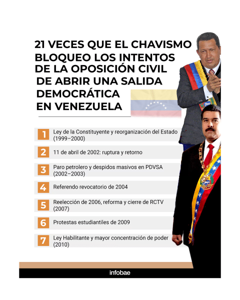 La siguiente cronología reconstruye las 21 principales ocasiones en las que el antichavismo y la sociedad civil intentaron abrir una salida democrática, y cómo cada intento fue bloqueado por un aparato estatal que se ha cohesionado, militarizado y desarrollado la capacidad de revertir o neutralizar cualquier avance: