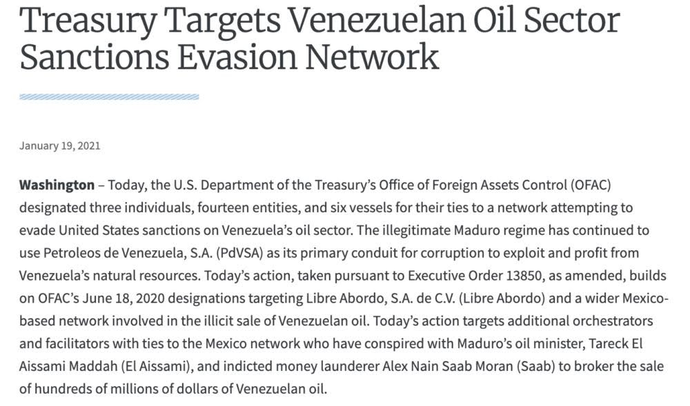 El Tesoro de Estados Unidos anunció ayer que «El Tesoro apunta a la Red de Evasión de Sanciones del Sector Petrolero de Venezuela «, mediante la cual Francisco D’Agostino, Alessandro Bazzoni, Philipp Apikian, Elemento y una red de seis barcos y 14 proyectiles son designados «por sus vínculos con una red que intenta evadir Sanciones de Estados Unidos al sector petrolero de Venezuela «. La noticia no sorprenderá a los lectores de este sitio. Hemos escrito bastante sobre el tema de que Alex Saab reemplace a Rosneft como el agente de comercio de evasión de sanciones del Tesoro. A principios de mayo de 2019, publicamos sobre Libre Abordo , un caparazón mexicano de dos bits sin antecedentes que de repente comenzó a hacer negocios con PDVSA. En junio de 2019,El Tesoro designó a Libre Abordo y algunos de los representantes de Saab en México . Fundamentalmente, Elemento fue fundamental para brindar apoyo logístico a la incursión de Libre Abordo en el comercio de petróleo venezolano. Elemento es un caparazón controlado por D’Agostino y Bazzoni. Cuando este sitio reveló la participación de Elemento, un abogado de Bazzoni en Londres ( Vanessa Tattersall – Holman Fenwick & Willan ) se puso en contacto y amenazó a este sitio con acciones legales.