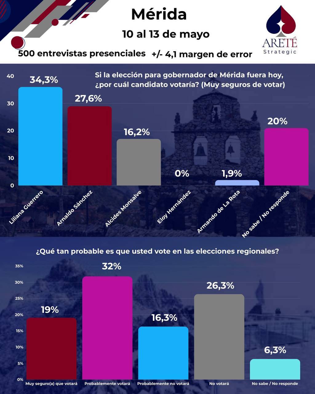 Areté Strategic realizó un estudio entre el 10 y el 13 de mayo, y Liliana Guerrero obtuvo un 34,3% y Arnaldo Sánchez (PSUV) 27,6%, Alcides Monsalve 16,2%, Armando De La Rota 1,9%, Eloy Hernández 0% y No sabe, no respondió un 20%.