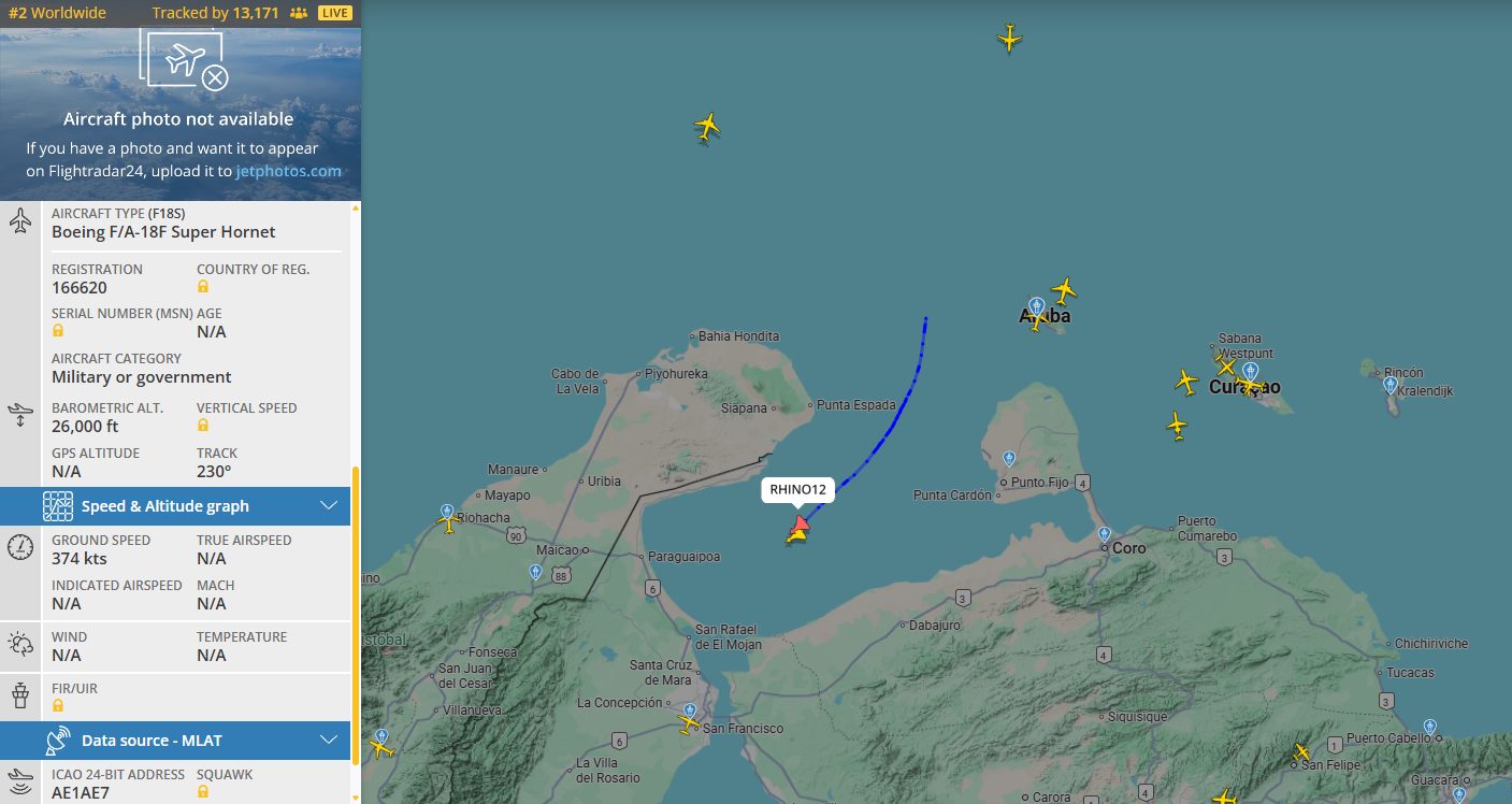 En el monitor digital FlightRadar24 se pueden observar en vivo a los cazabombarderos don las denominaciones «RHINO11» y «RHINO12» mientras se acercaban al Lago de Maracaibo desde el interior del Golfo de Venezuela.