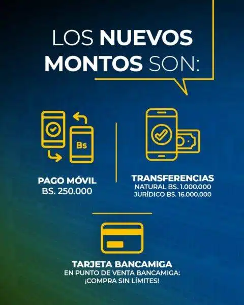 A partir de ahora, los clientes de Bancamiga podrán realizar transferencias hasta Bs. 16.000.000 en el caso de personas jurídicas y Bs. 1.000.000 para personas naturales. Las operaciones por Pago Móvil suben hasta Bs. 250.000.