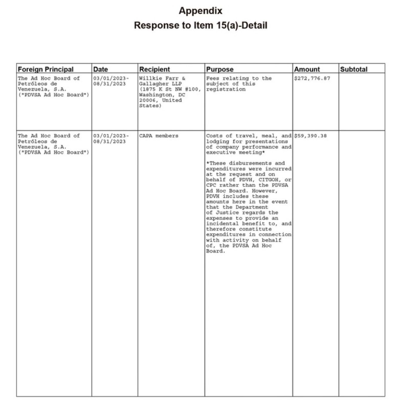 Otro documento FARA revela los honorarios legales y gastos relacionados con la representación de la Junta Ad Hoc de PDVSA. Entre el 1 de marzo y el 31 de agosto de 2023, Willkie Farr & Gallagher LLP recibió $272.776,87 en honorarios por servicios relacionados con el registro FARA.