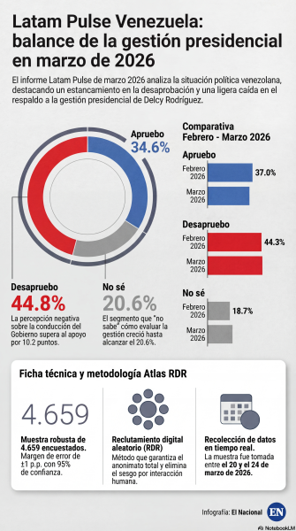 Contrario a la aceptación de la opositora, la gestión de Delcy Rodríguez registra un índice de rechazo superior a su respaldo. Un 44,8% de los consultados desaprueba la forma en que está conduciendo el gobierno interino, frente a 34,6% que la aprueba. Finalmente, 20,6% de la población encuestada manifestó “no saber”.