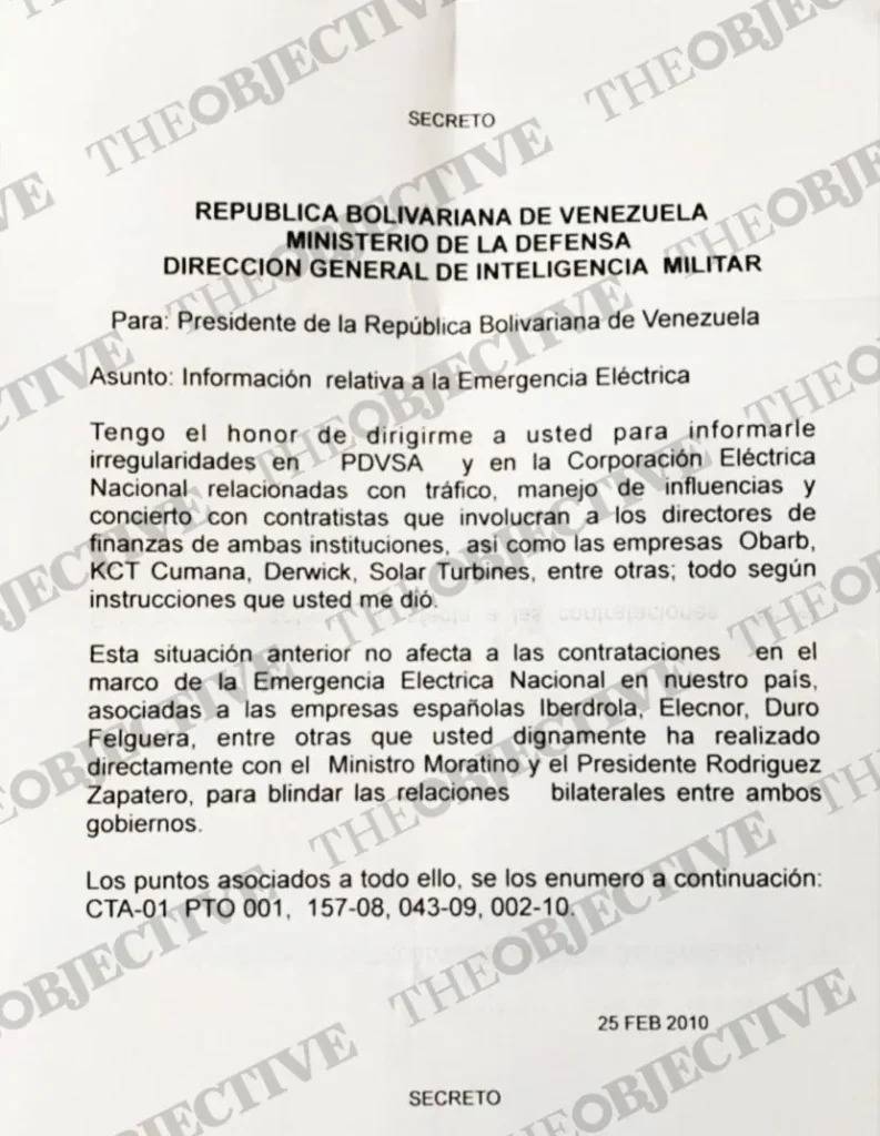 Además, el jefe de la Inteligencia y Contrainteligencia del chavismo, Hugo Carvajal, alias El Pollo, entregó el 25 de febrero de 2010 al entonces presidente de la dictadura de Venezuela, Hugo Chávez, un informe secreto en el que detallaba que la contratación de la empresa española Duro Felguera se llevó a cabo directamente con el exministro de Asuntos Exteriores de España Miguel Ángel Moratinos y el expresidente José Luis Rodríguez Zapatero en el marco de un acuerdo para «blindar las relaciones bilaterales entre ambos gobiernos», según el documento publicado en exclusiva por THE OBJECTIVE.