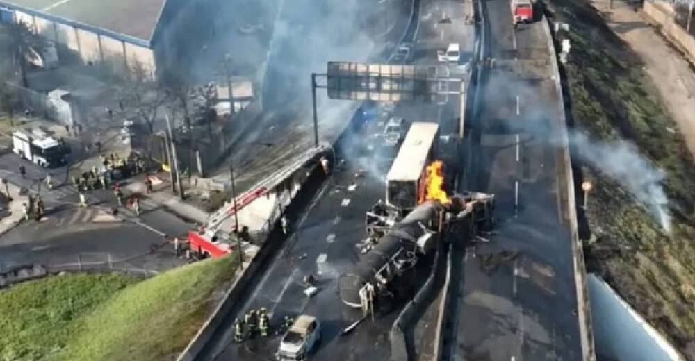 La explosión sucedió en la intersección de la autopista más importante del país, la Ruta 5, con una secundaria y generó un gran incendio que alcanzó a otros siete vehículos, que a la misma hora iban transitando por la autopista, y también un desguace de vehículos, informó la policía chilena.