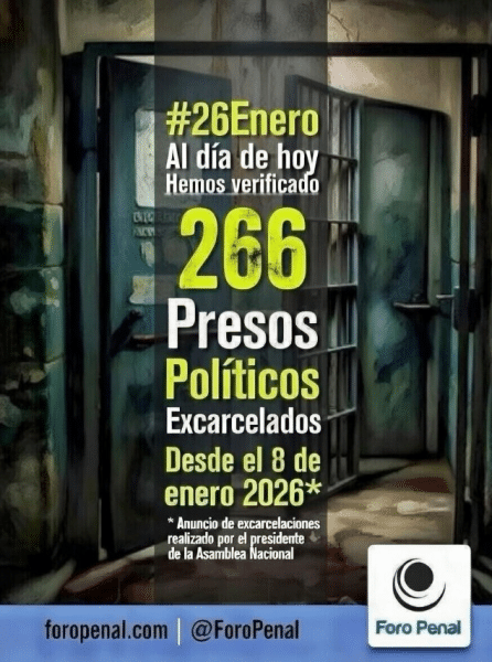 La ONG Foro Penal informó la mañana de este lunes 26 de enero que verificó al menos 266 nuevas excarcelaciones de presos políticos en Venezuela en las últimas horas, como parte del proceso de liberaciones anunciado el pasado 8 de enero.