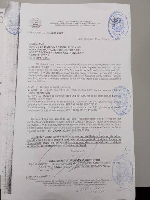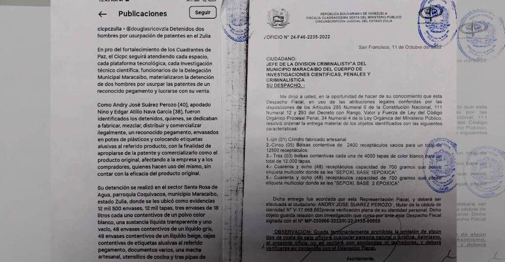 El emprendedor afirma que “al no proceder la causa por usurpación de patente, la fiscal de Flagrancia cambia el calificativo a hurto calificado contra una persona que para la fecha ni siquiera conocemos y en consecuencia somos privados de libertad para posteriormente otorgarnos una medida que nos permite salir libres y ahí fuimos con facturas en mano a retirar nuestros productos que se nos incautó, los cuales nos devolvieron con un oficio de entrega debidamente verificado y sellado por el fiscal Cuadragésimo Sexto (46°), Emiro Araque, quien autorizó dicha entrega ”.