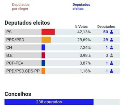 LeerCon el 99,1 % de los votos contabilizados el Partido Socialista (PS), que lidera el actual primer ministro António Costa, logró alcanzar la mayoría a