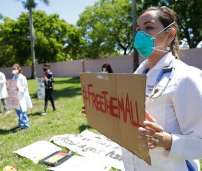 La Dra. Claudia Álvarez sostiene un letrero que dice “#Libéralos a todos” mientras protesta por las condiciones que enfrentan los detenidos por la Po