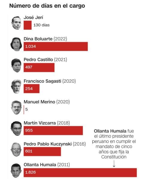 El último presidente de Perú que completó su mandato fue Ollanta Humala (2011-2016). Luego, Pedro Pablo Kuczynski renunció en 2018 antes de una votación del Congreso; su vicepresidente, Martín Vizcarra, fue destituido en 2020; Manuel Merino asumió como presidente del Congreso pero duró cinco días en el cargo; y Francisco Sagasti completó el período. Posteriormente, Pedro Castillo asumió tras ganar las elecciones de 2021, antes de ser sucedido por Boluarte y Jerí.