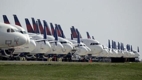 En esta foto del 1 de abril de 2020, varias docenas de aviones Delta Air Lines están estacionados en el aeropuerto internacional de Kansas City en Kansas City, Missouri. Crédito: AP