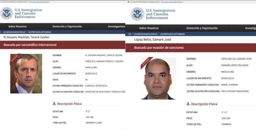 El Servicio de Inmigración y Control de Aduanas de Estados Unidos (ICE) muestra como “capturados” a los venezolanos Tareck El Aissami y Samark López Bello, quienes figuraban entre los buscados por las autoridades estadounidenses.