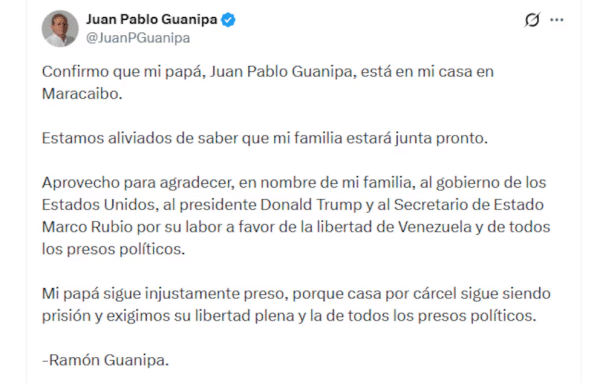 Confirmo que mi papá, Juan Pablo Guanipa, está en mi casa en Maracaibo”, escribió en la red social X, al tiempo que expresó el alivio de la familia por su regreso al hogar. Sin embargo, remarcó que la medida no equivale a una liberación.