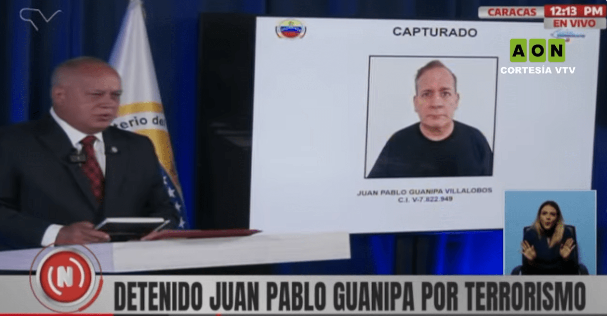 El ministro para Relaciones Interiores, Justicia y Paz, Diosdado Cabello, informó que la captura del dirigente de la extrema derecha Juan Pablo Guanipa, ocurrió en la madrugada de este viernes 23 de mayo.