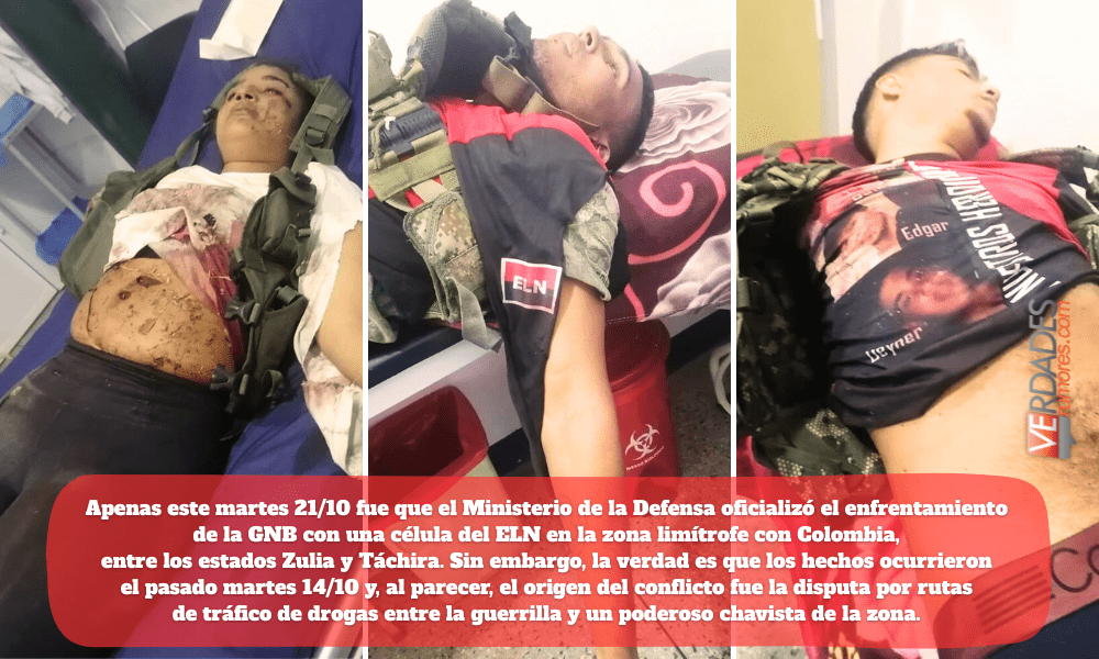 ENFRENTAMIENTO. Apenas fue el pasado martes 21/10 que el Ministerio de la Defensa oficializó un enfrentamiento ocurrido entre personal de la GNB y una célula del ELN, en el cual hubo varios muertos. Lo extraño es que anuncian los hechos una semana después de haberse registrado el percance, ya que información no oficial habla de que los hechos acaecieron el pasado martes 14/10 en el camellón de Caño Amarillo, parroquia Udón Pérez, del municipio Catatumbo. Los detalles que recibí indican que el miércoles 15/10 todo estaba tranquilo, pero al día siguiente [jueves 16/10] volvieron a registrarse enfrentamientos. ¿Por qué la refriega? Distinta a la versión que indicó Min-Defensa sobre una supuesta operación contra el narcotráfico, mis fuentes hablan de que el enfrentamiento se origina a raíz de disputas por rutas de comercialización de drogas entre esta célula del ELN y el grupo de un poderoso chavista del Táchira. ¿Por qué tardaron una semana en hacer público lo ocurrido? La respuesta más lógica en tiempos de revolución es que estaban armando el “relato” con el fin de tapar las verdaderas razones del enfrentamiento. La fuente además de información me hizo llegar imágenes de tres guerrilleros muertos, entre ellos una mujer.