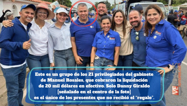 FELICES. Cuando ya la columna de la semana pasada estaba publicada, circuló una fotografía en los grupos de WhatsApp de Un Nuevo Tiempo. ¿ Qué de especial tenía la foto? Pues que mostraba a una parte de los 21 privilegiados del gabinete de Manuel Rosales que cobraron la liquidación de 20 mil dólares que les entregaron en efectivo para no dejar huellas, aunque el escándalo siempre estalló. ¿Cuál era el comentario general? Pues que indudablemente estaban felices y sonrientes porque salieron con dinero extra del gobierno regional, mientras la mayor parte del gabinete entregó sus cargos sin nada. Me aclaran que de todos los que aparecen en la imagen, solo uno no recibió nada y es el caballero de franela azul que está en el medio y que se llama Danny Giraldo, quien ocupaba la presidencia de Funidez. Como parte de las informaciones que han circulado sobre los privilegios que tenían los más cercanos a Manuel, me cuentan que hay un grupito que además de su sueldo también recibía un bono de 5 mil dólares mensuales, por supuesto, también en efectivo.